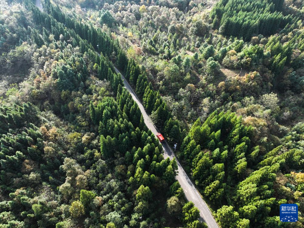 张建、张华、张忠与同事驾驶森林巡防车(橙色车辆)在贵州省毕节市七星关区拱拢坪国有林场巡山护林(11月13日摄,无人机照片)。