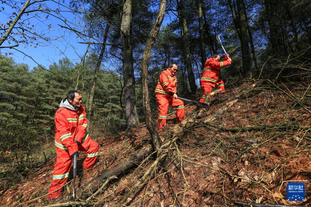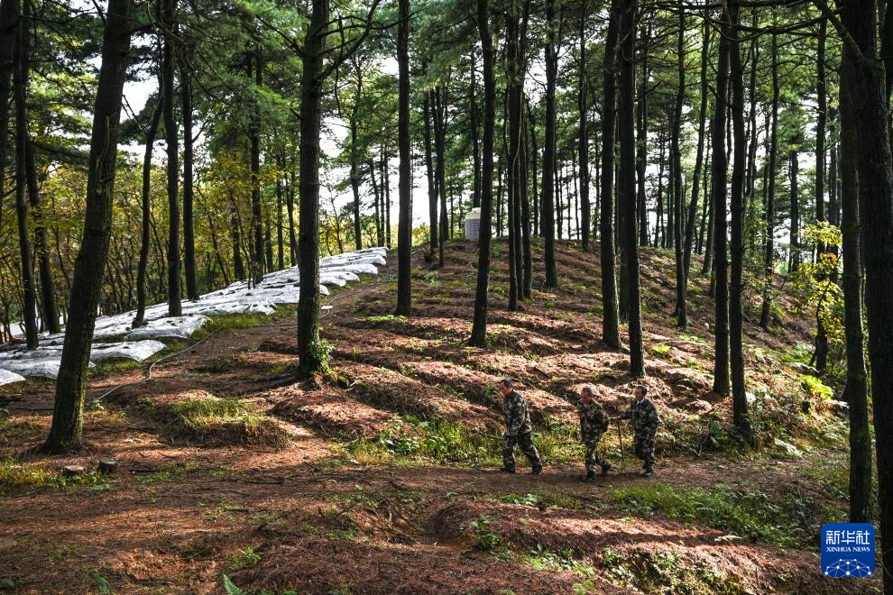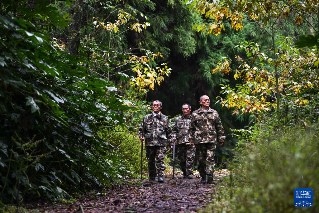 张建(右)、张华(左)、张忠在贵州省毕节市七星关区拱拢坪国有林场巡山护林(11月13日摄)。