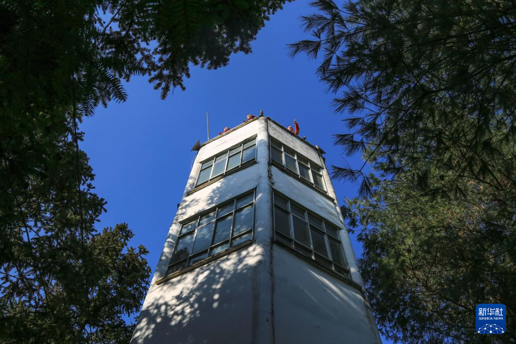 张建、张忠、张华在贵州省毕节市七星关区拱拢坪国有林场的瞭望塔上观察林区动态(2019年1月3日摄)。