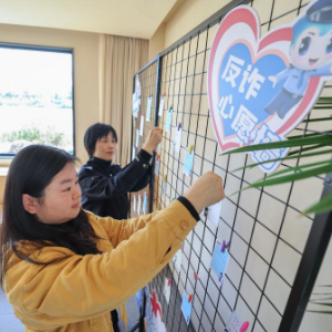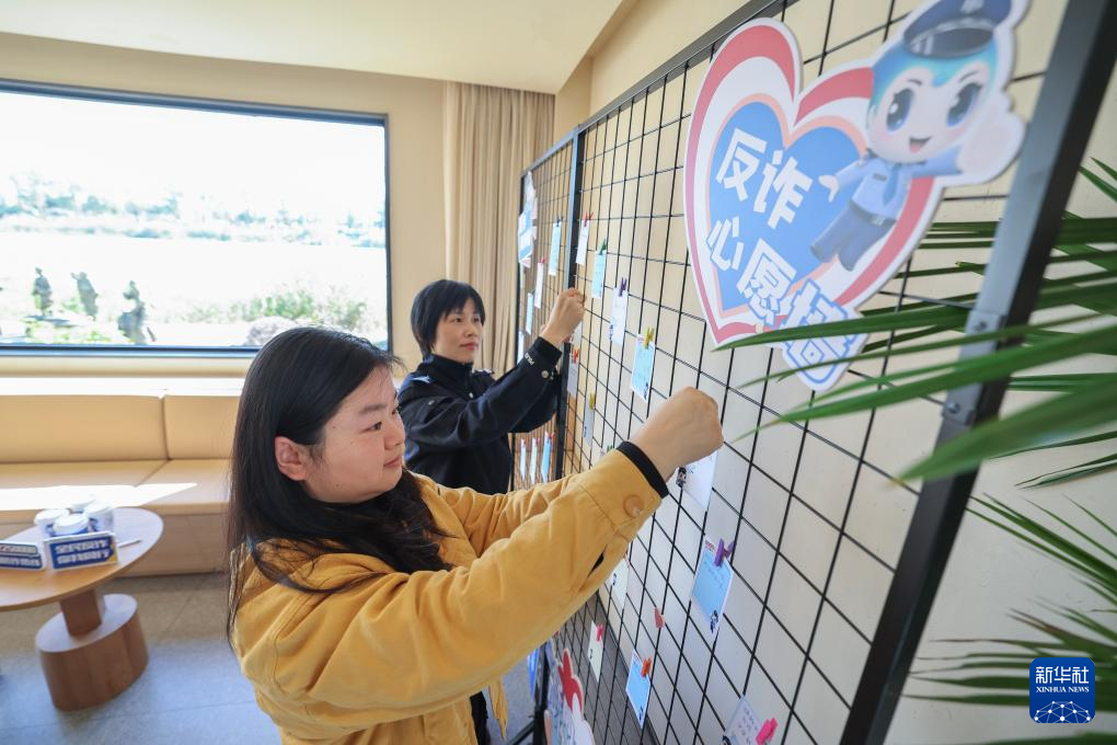 11月19日,道场派出所民警与游客在民宿“反诈心愿墙”上挂上自己手写的反诈小贴士。