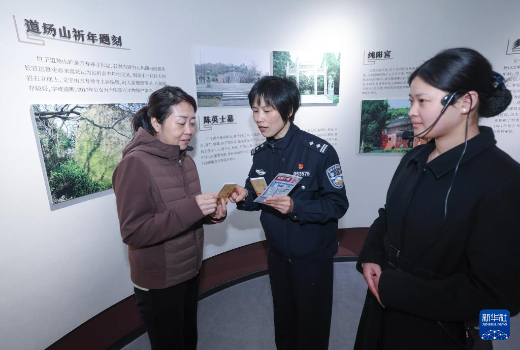 11月19日,道场派出所民警在乡村博物馆里给游客送上反诈书签并进行反诈宣传。