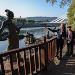 11月20日,在诸暨西施故里景区,参加今年金牌导游选拔的年轻导游(右)给游客讲述西施的故事。
