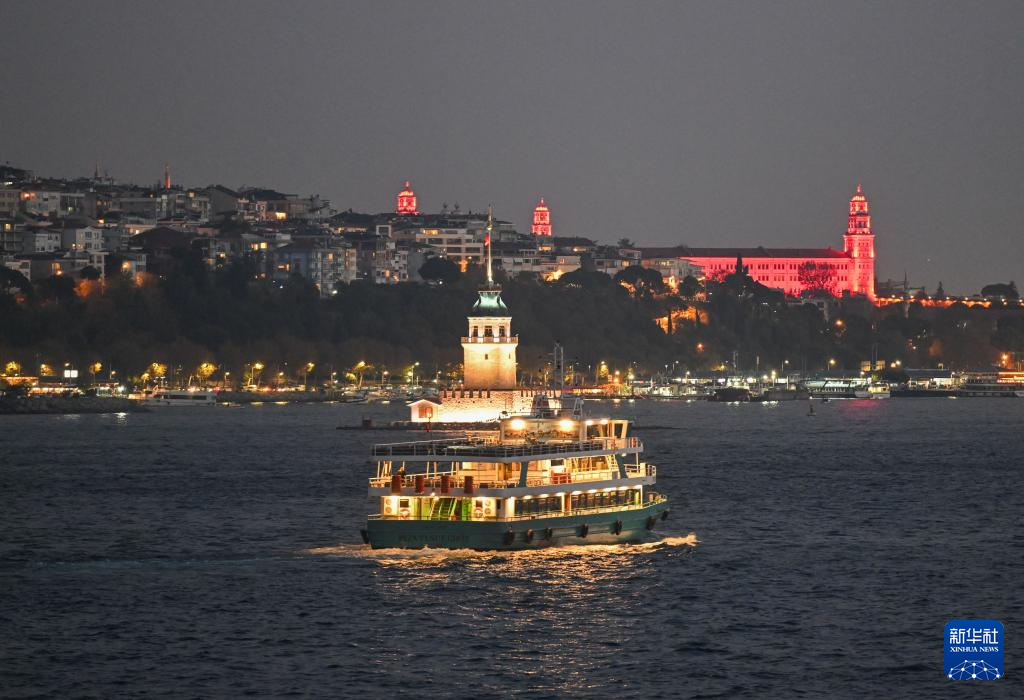 夜幕降临,博斯普鲁斯海峡上船只穿梭,两岸灯火璀璨。