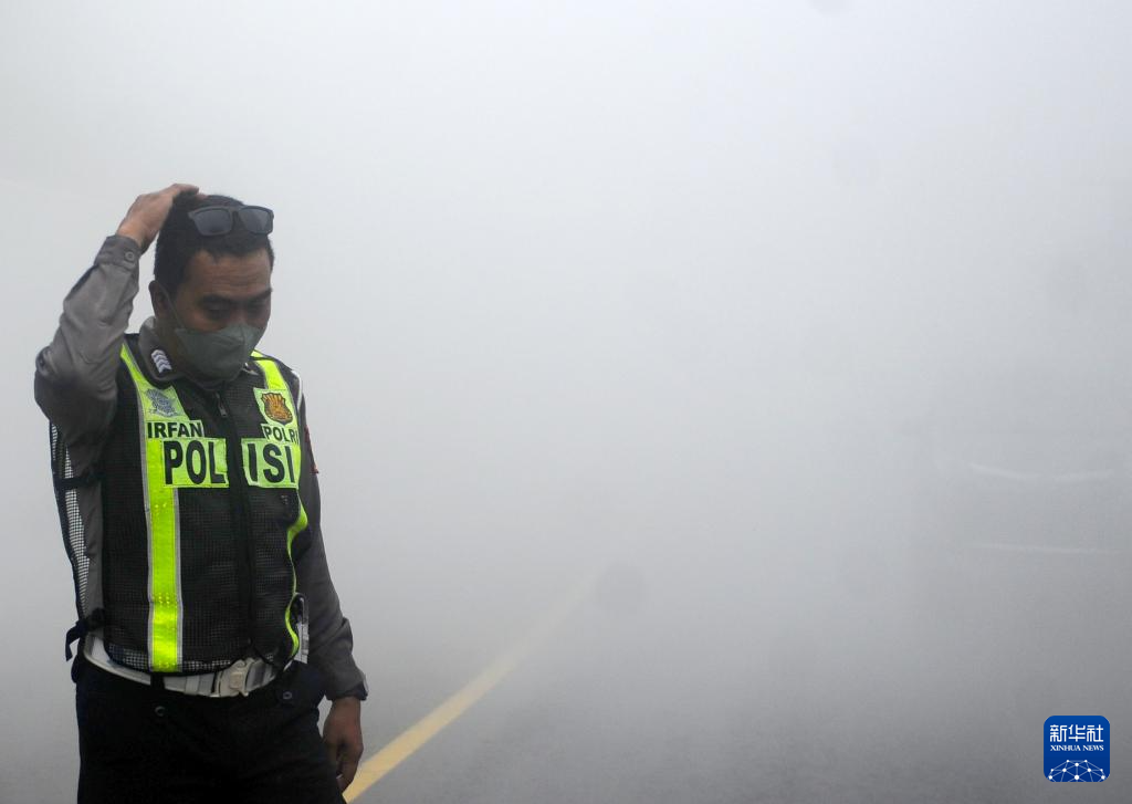 11月21日,在印度尼西亚东爪哇省,一名警察冒着火山灰执勤。
