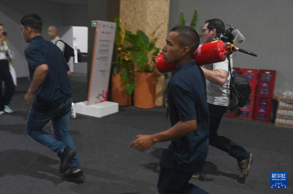 11月20日,在巴西帕拉州贝伦市《联合国气候变化框架公约》第三十次缔约方大会(COP30)会场内,一名工作人员肩扛灭火器奔跑。