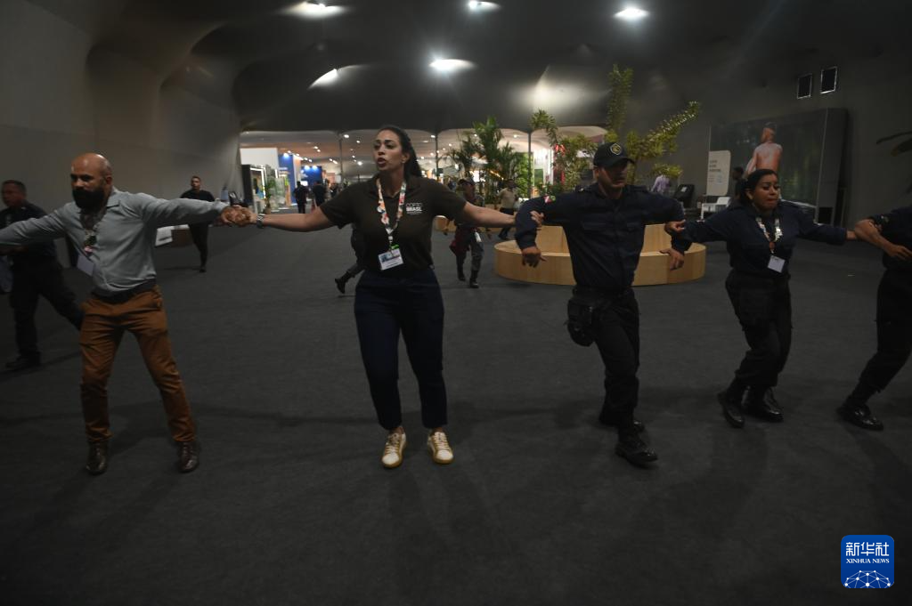 11月20日,在巴西帕拉州贝伦市《联合国气候变化框架公约》第三十次缔约方大会(COP30)会场内,安保人员手拉手疏导人群。
