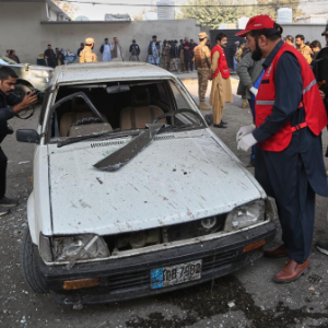 11月24日,在巴基斯坦白沙瓦,救援人员检查自杀式爆炸袭击现场一辆损毁的汽车。