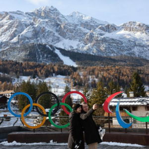 11月22日,在意大利科尔蒂纳丹佩佐,人们在奥运会、残奥会会徽前留影。