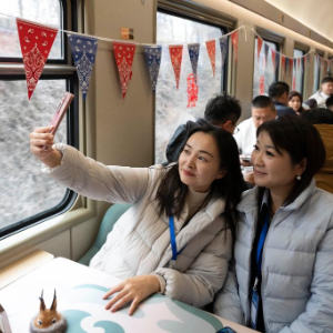 11月26日,游客在Y783次“悠享龙江·银旅号”旅游列车上拍照。