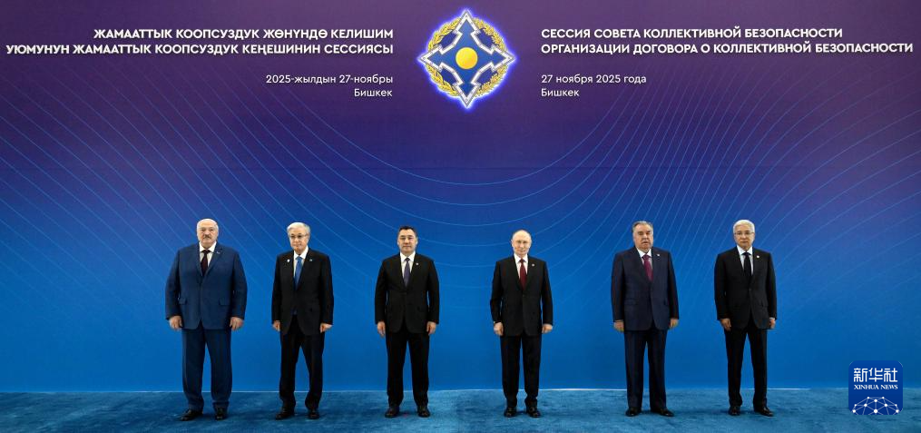 11月27日,在吉尔吉斯斯坦比什凯克,(从左至右)白俄罗斯总统卢卡申科、哈萨克斯坦总统托卡耶夫、吉尔吉斯斯坦总统扎帕罗夫、俄罗斯总统普京、塔吉克斯坦总统拉赫蒙、集安组织秘书长塔斯马加姆别托夫在集安组织集体安全理事会会议现场合影。