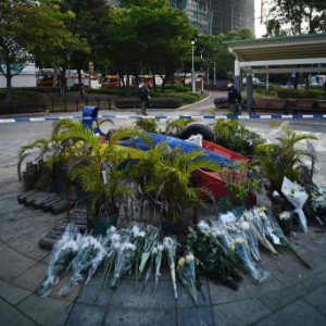 这是11月29日清晨在火灾后的大埔宏福苑楼宇附近拍摄的市民寄托哀思的花束。