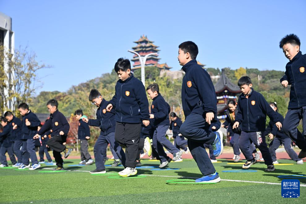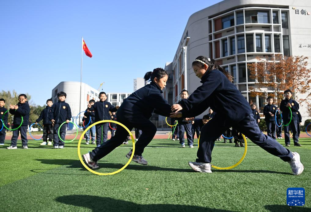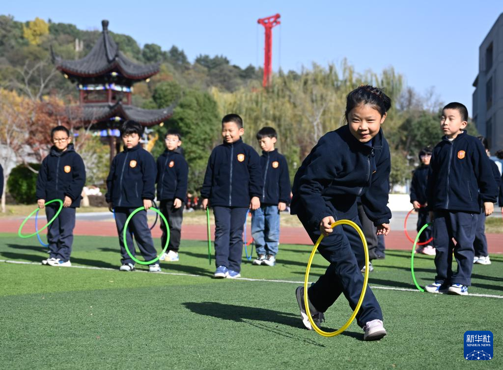 11月28日,在位于南京市鼓楼区的天妃宫小学,学生在上体适能课。
