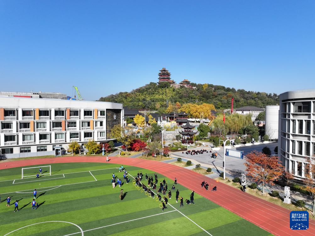 11月28日,在位于南京市鼓楼区的天妃宫小学,学生在操场上运动(无人机照片)。