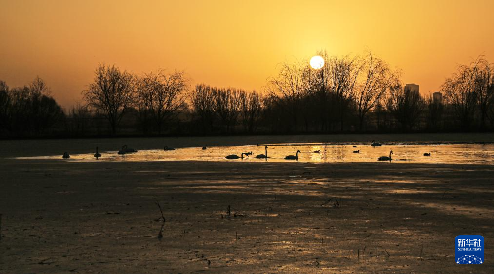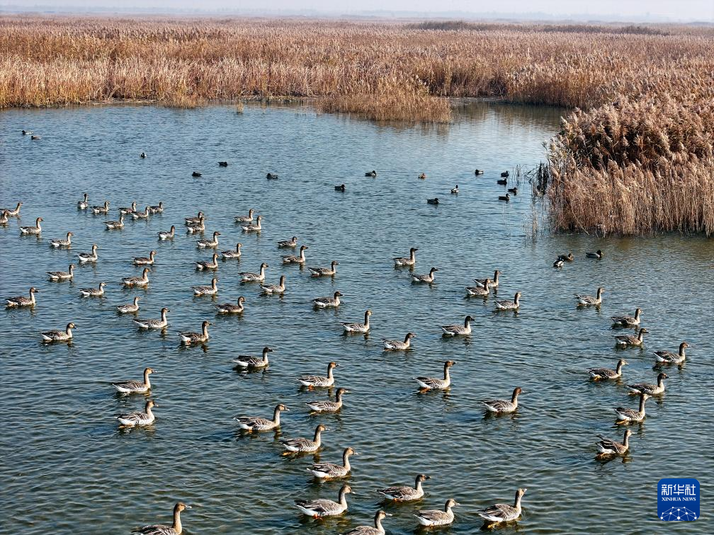 11月30日,群鸟在甘肃张掖国家湿地公园栖息游弋。