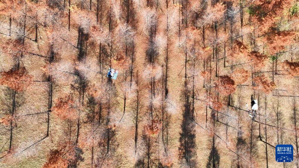 11月30日,游客在贵州省遵义市播州区播雅湿地公园水杉林游玩(无人机照片)。