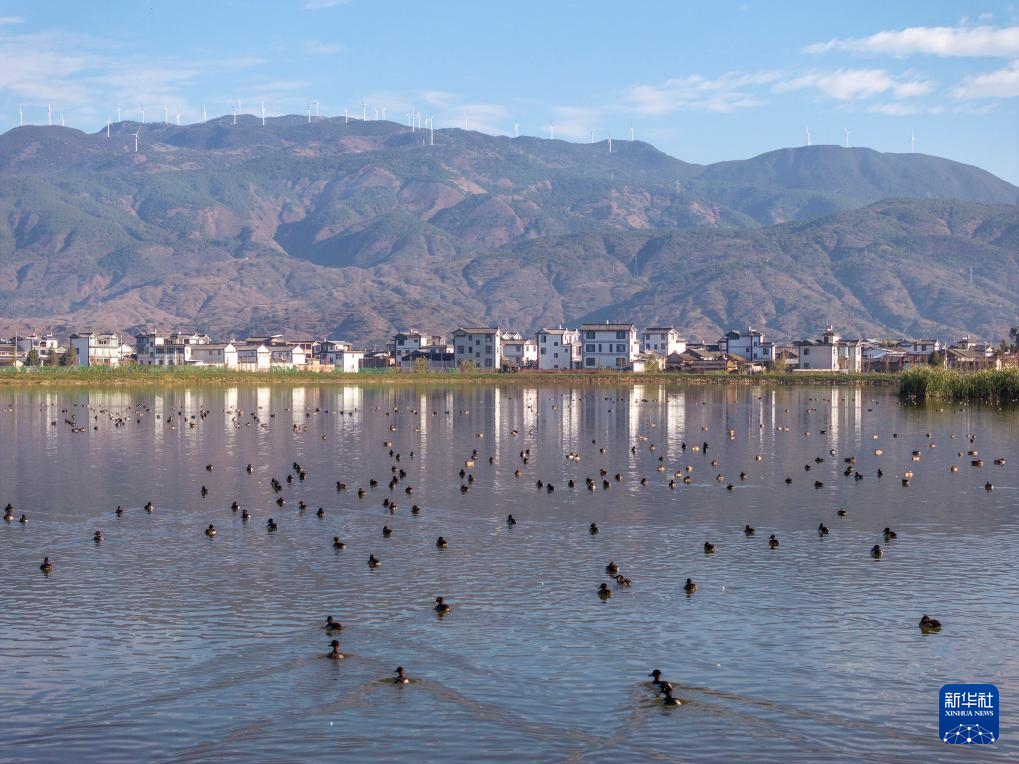 11月30日,在云南省大理白族自治州洱源县永安湿地,群鸟在湿地中觅食(无人机照片)。