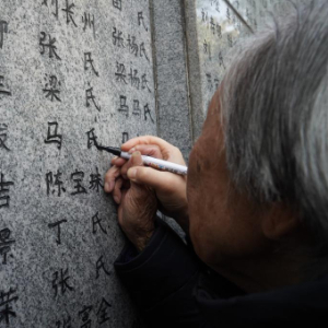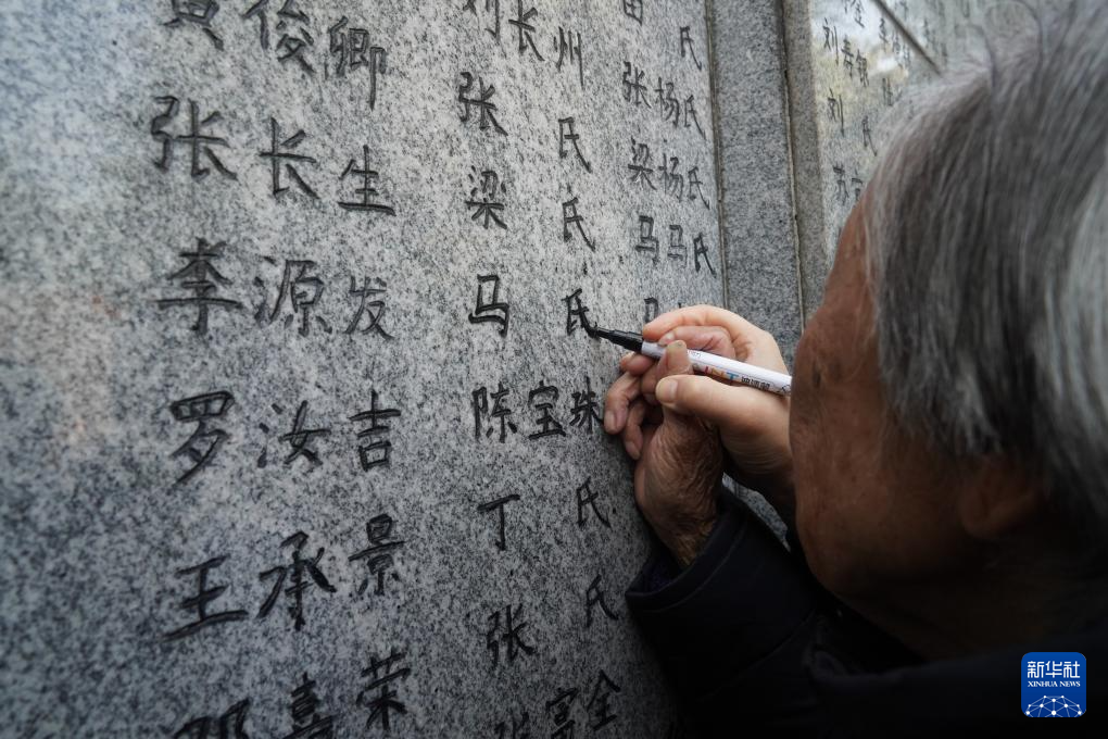 11月30日,南京大屠杀幸存者夏淑琴在“哭墙”上描名。