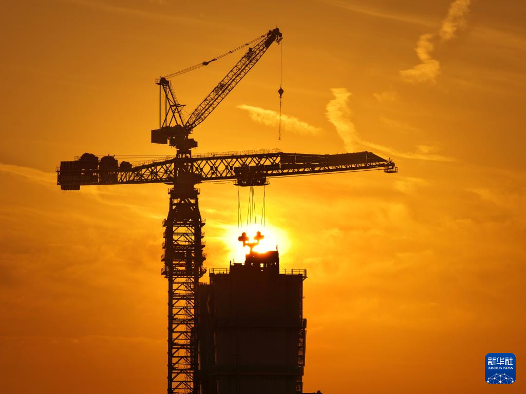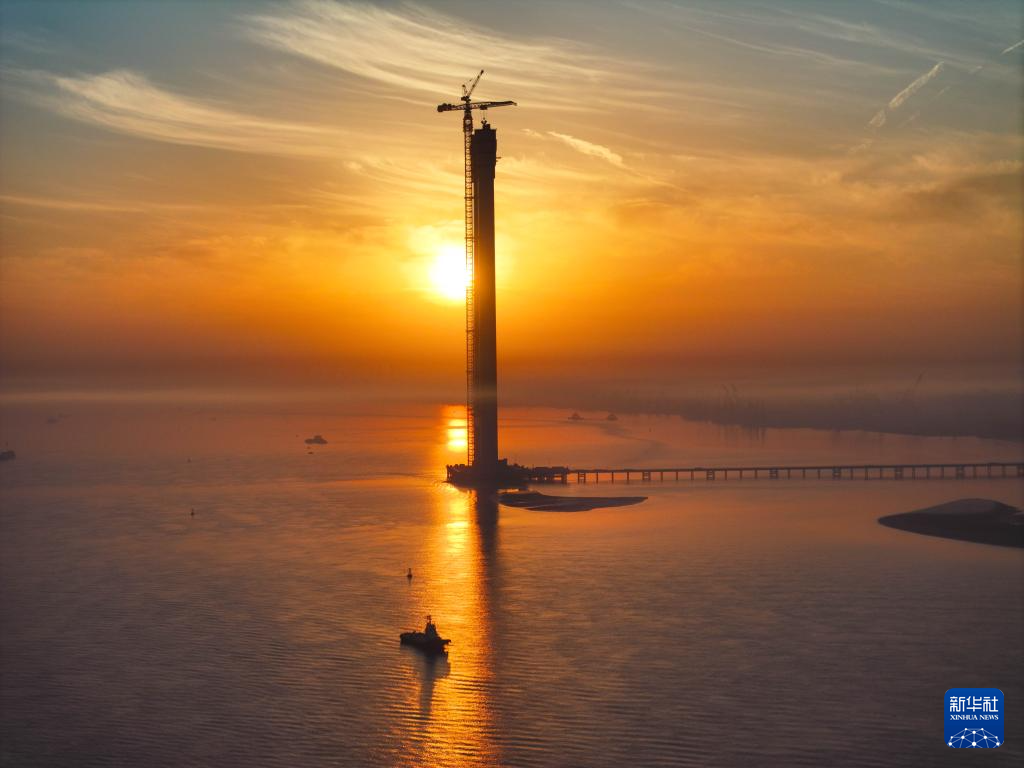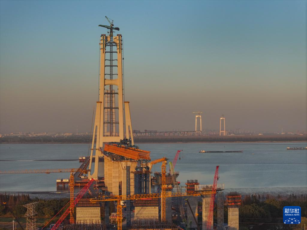 日出时分拍摄的张靖皋长江大桥南航道桥南主塔施工现场(11月30日摄,无人机照片)。