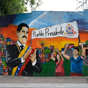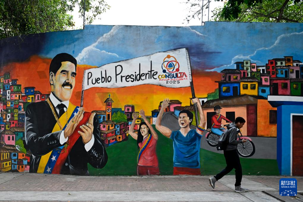 12月2日,在委内瑞拉首都加拉加斯,行人从支持委内瑞拉总统马杜罗的涂鸦墙前走过。