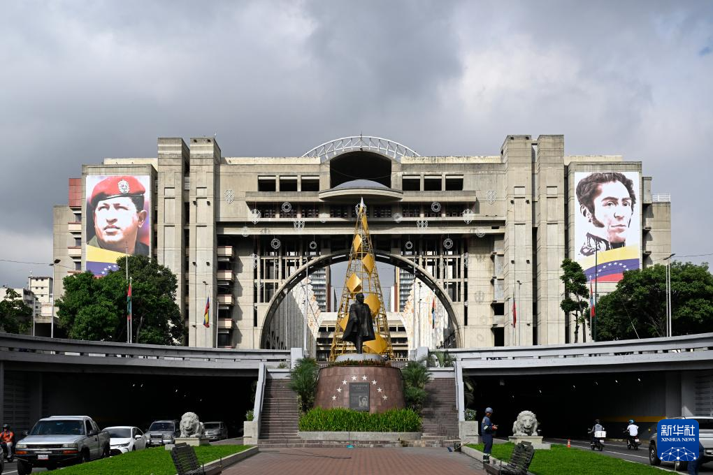 这是12月2日在委内瑞拉首都加拉加斯拍摄的玻利瓦尔大街,委内瑞拉前总统查韦斯(左)和委内瑞拉民族英雄、南美解放者西蒙·玻利瓦尔的肖像海报悬挂在显著位置。