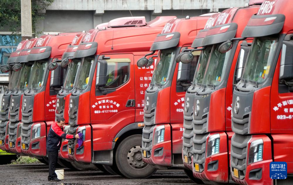 12月3日,在重庆市綦江区三江街道的重庆高速交通安全产业园内,地平面(重庆)供应链有限公司的工作人员清洗运输车辆。