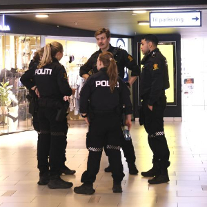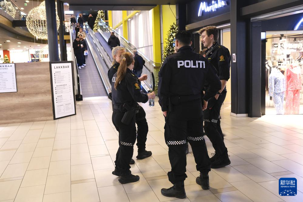 12月8日,在挪威首都奥斯陆的斯托罗购物中心内,警察在巡逻。