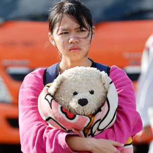 12月8日,在泰国武里南府,一名撤离边境省份的女子在一处避难所休息。