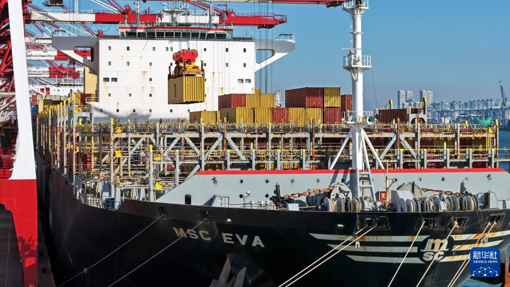 12月8日,“地中海伊娃”轮在青岛港前湾港区装卸作业。