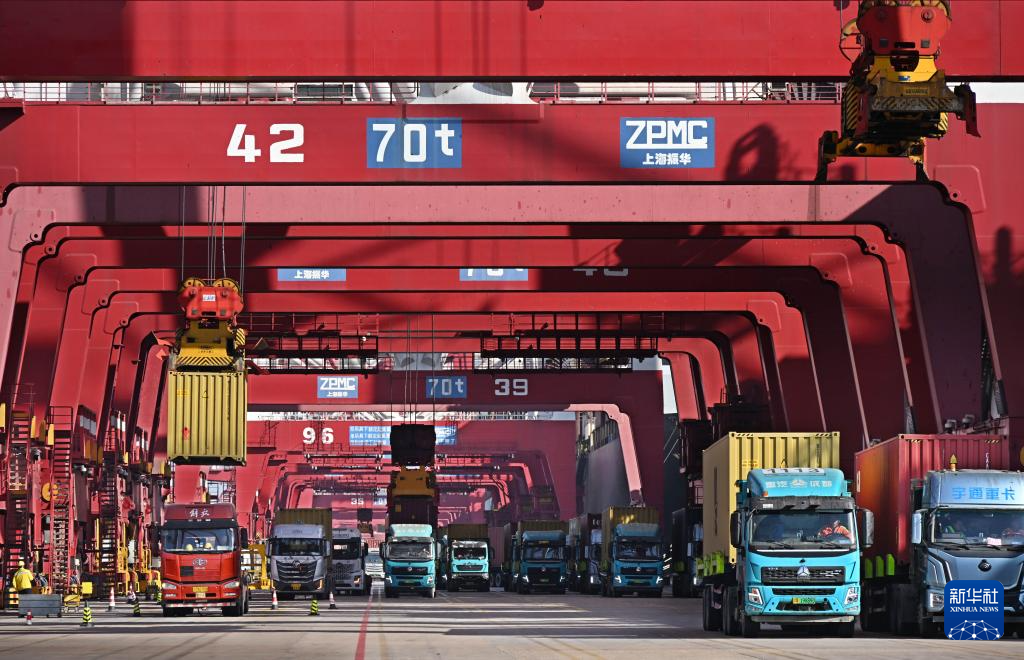 12月8日,集装箱货运卡车在青岛港前湾港区装卸作业。