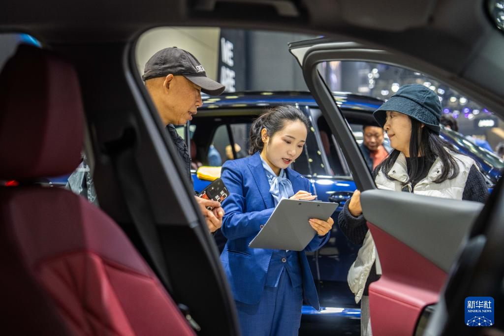 12月10日,在长沙国际会展中心,工作人员(左)在介绍参展车辆。