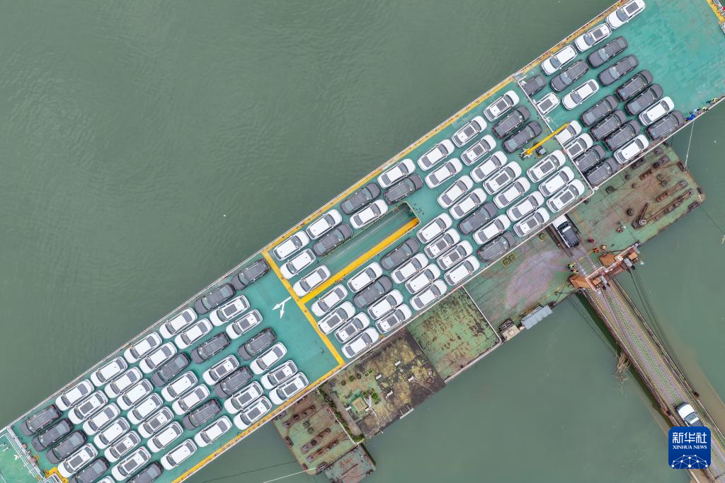 12月5日,在重庆果园港滚装码头,“重庆造”新能源汽车在装船,之后将通过“江海联运”的方式出海(无人机照片)。