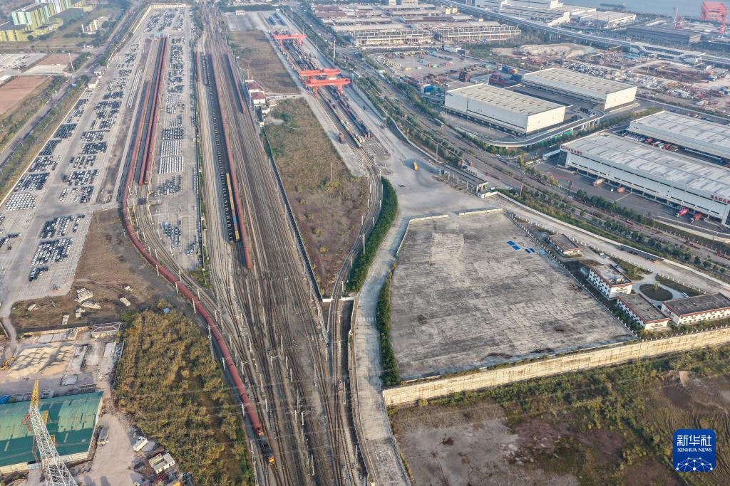 11月29日,一列满载“重庆造”新能源汽车的货运专列驶出重庆果园港国家物流枢纽铁路货运鱼嘴站商品车物流基地(无人机照片)。