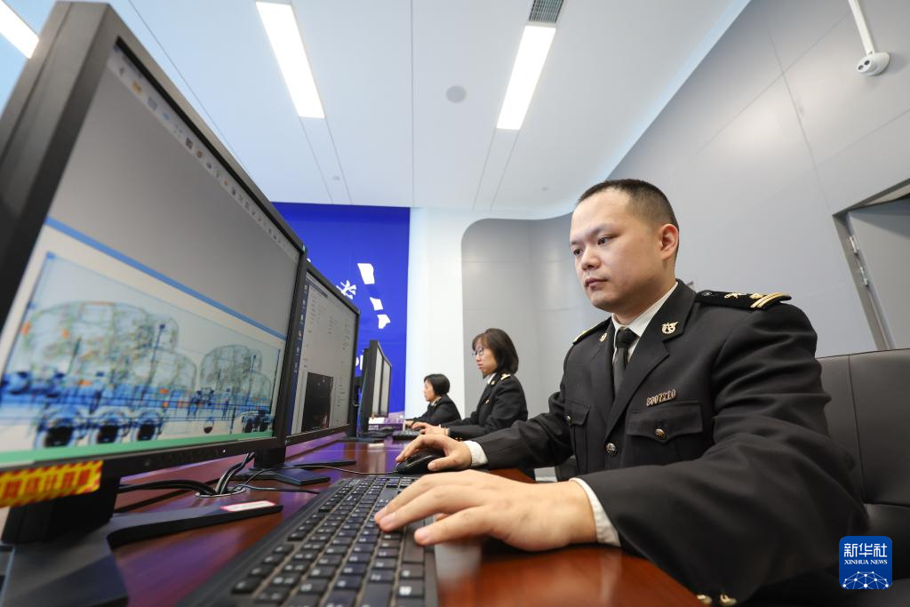 12月4日,重庆海关所属重庆港海关关员在集中审像中心审看即将出口的新能源汽车图像。