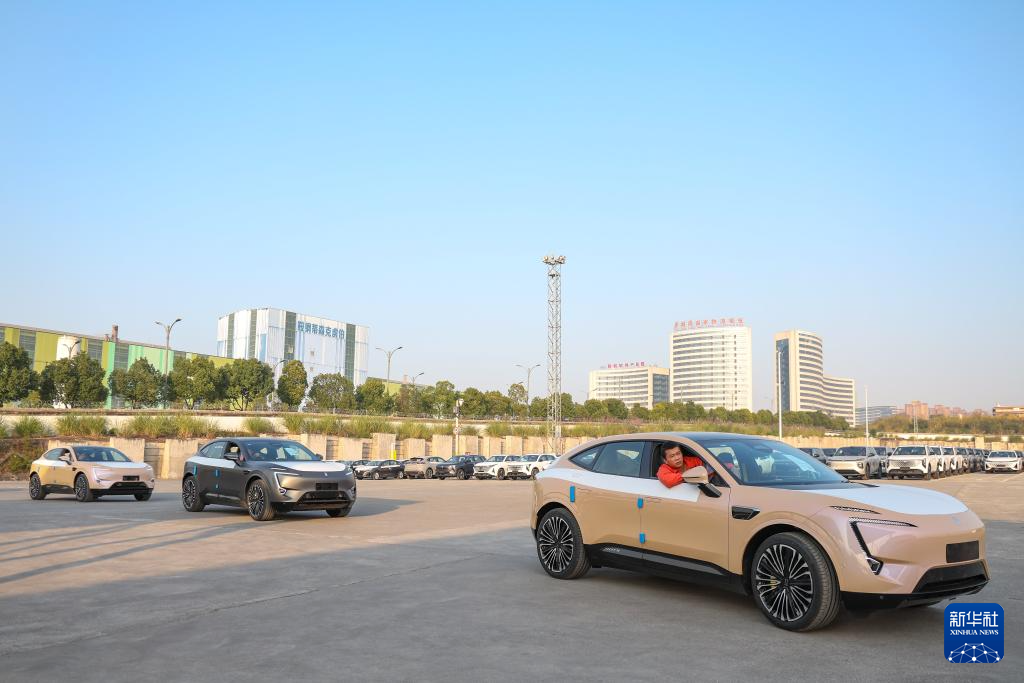 11月29日,在重庆果园港国家物流枢纽铁路货运鱼嘴站商品车物流基地,工作人员驾驶“重庆造”新能源汽车排队驶入“渝车”专列。
