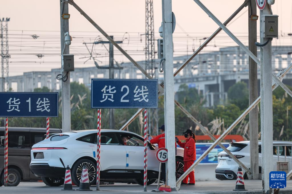 11月29日,在重庆果园港国家物流枢纽铁路货运鱼嘴站商品车物流基地,工作人员在登记即将登上“专列”的“重庆造”新能源汽车。