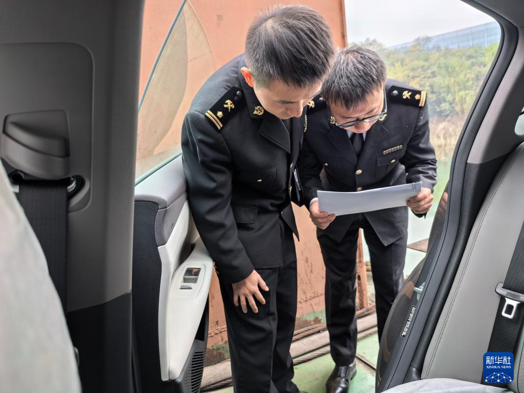 12月5日,在重庆果园港,重庆海关所属重庆港海关关员在核对出口新能源汽车铭牌。