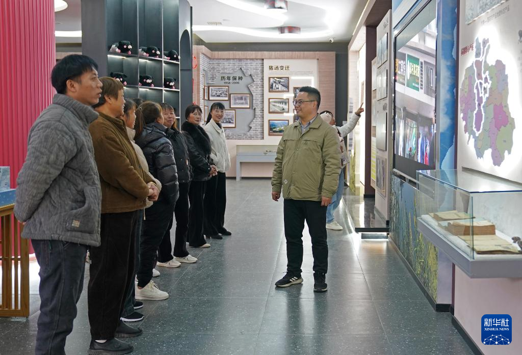 在位于江西省修水县县城的杭猪文化数字展示中心,卢丹(右一)向参观者介绍当地杭猪的养殖历史与文化(12月4日摄)。