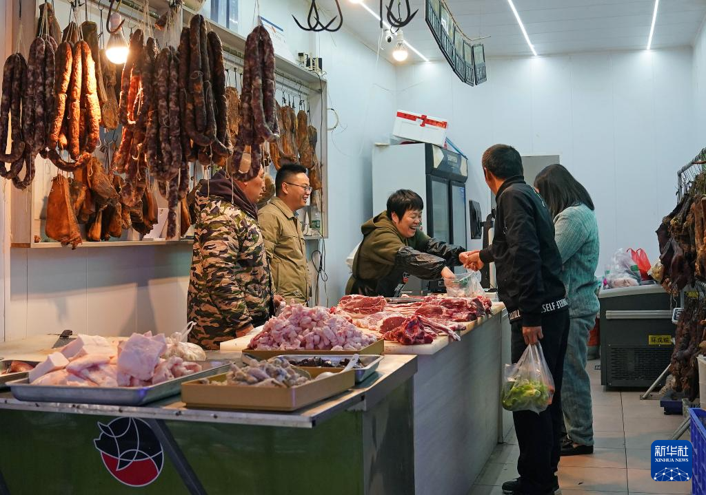 卢丹(左二)在江西省修水县县城的一个幕村黑花猪直销店查看销售情况(12月4日摄)。
