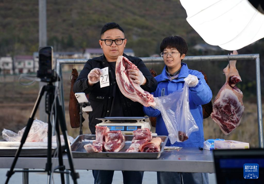 在位于江西省修水县港口镇红苏村的幕村杭猪加工基地,邹玲丽(右)与主播在直播平台销售猪肉(12月3日摄)。