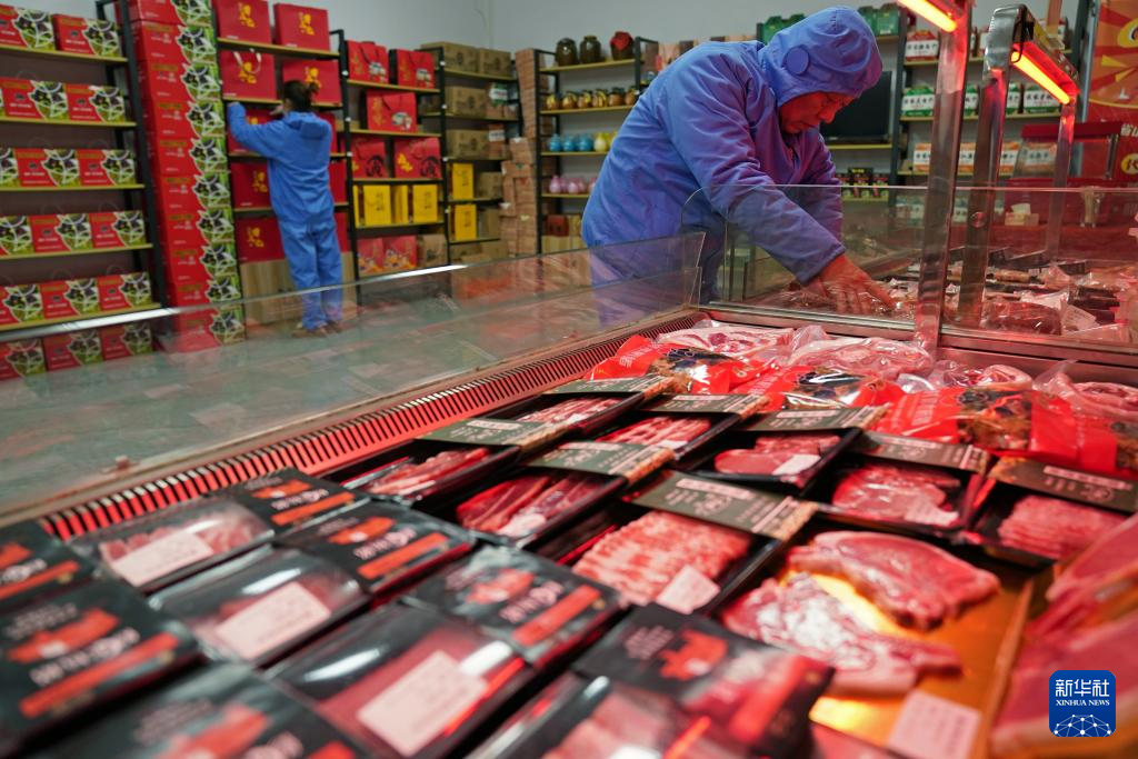 在位于江西省修水县港口镇红苏村的幕村杭猪加工基地,在基地工作的村民在摆放猪肉制品(12月3日摄)。
