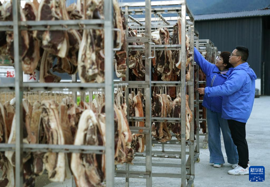 在位于江西省修水县港口镇红苏村的幕村杭猪加工基地,卢丹(右)与邹玲丽在查看晾晒的猪肉产品(12月3日摄)。