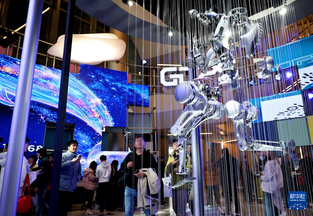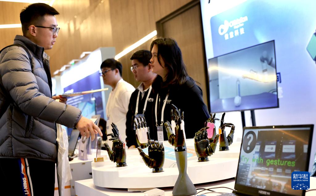 12月12日,参观者在可穿戴机器外骨骼展品前交流讨论。
