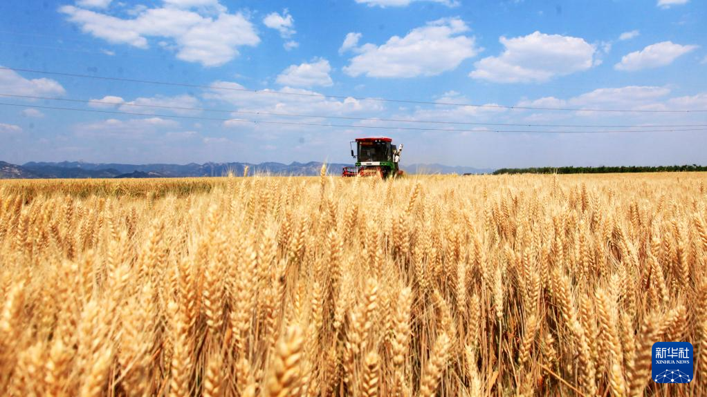 5月24日,山东省临沂市平邑县农民驾驶收割机收割小麦。