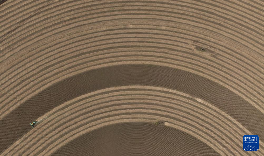 9月29日,在北大荒集团黑龙江尾山农场有限公司第一管理区,农机进行大豆收获作业(无人机照片)。