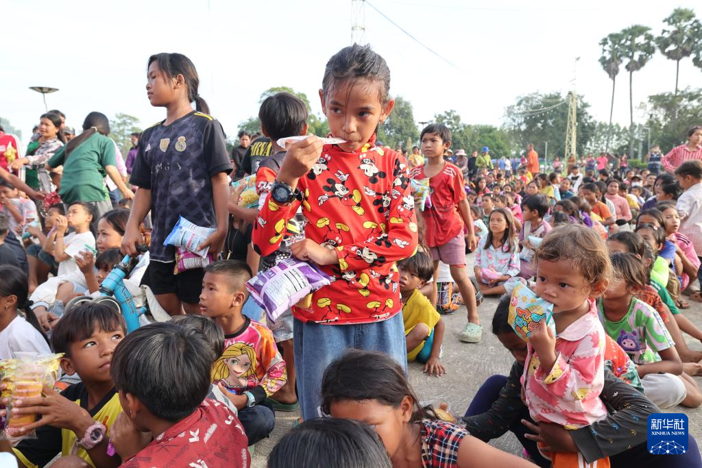 12月12日,在柬埔寨班迭棉吉省的一处居民安置点,因柬泰边境冲突而撤离的柬埔寨儿童领取零食。
