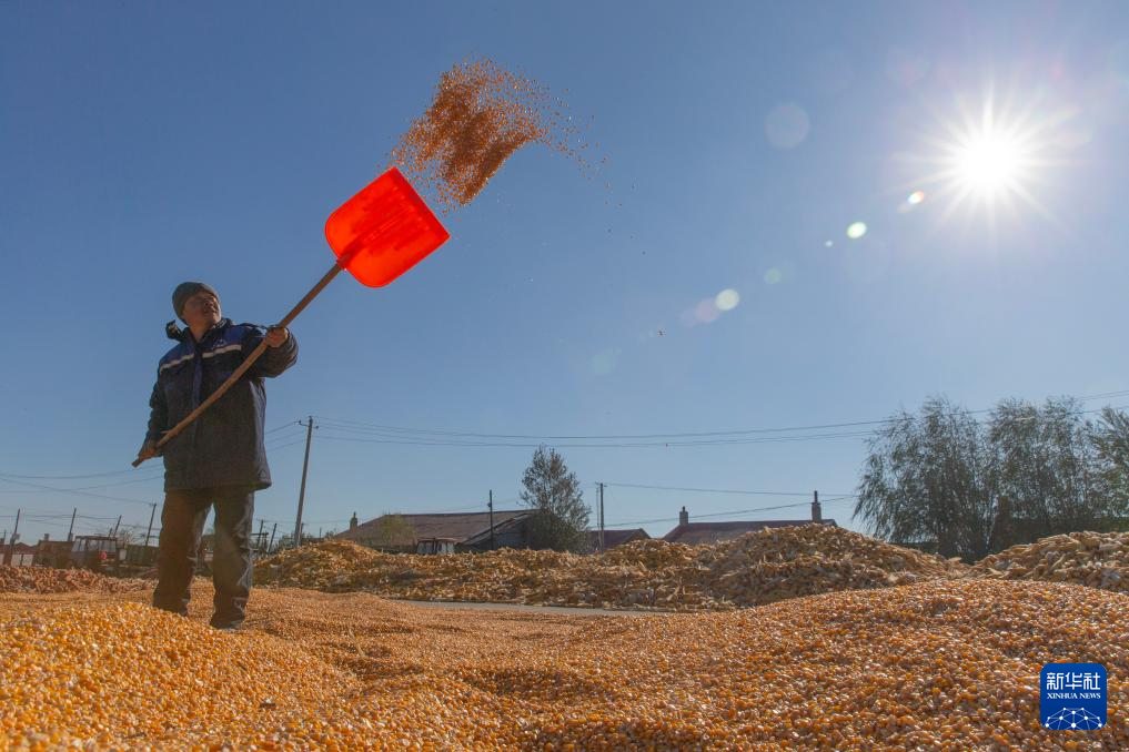 10月23日,在黑龙江省佳木斯市富锦市大榆树镇一处晾晒场,农民在晾晒玉米。