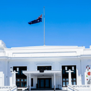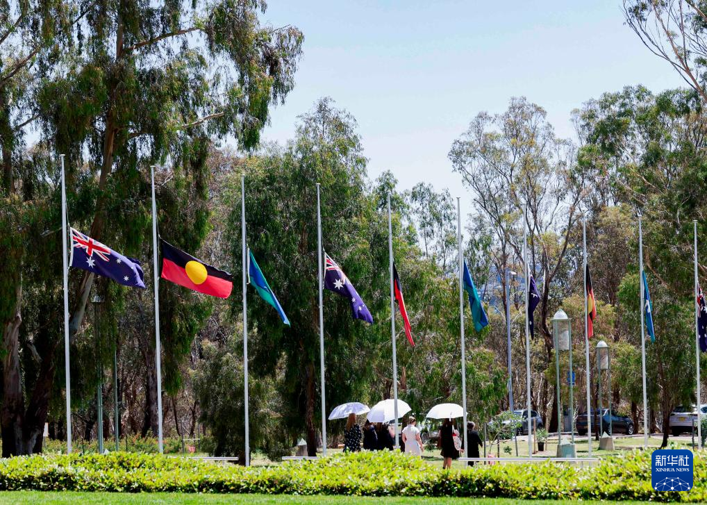12月15日,在澳大利亚首都堪培拉,位于国会大厦附近的旗杆降半旗悼念悉尼邦迪滩枪击事件遇难者。