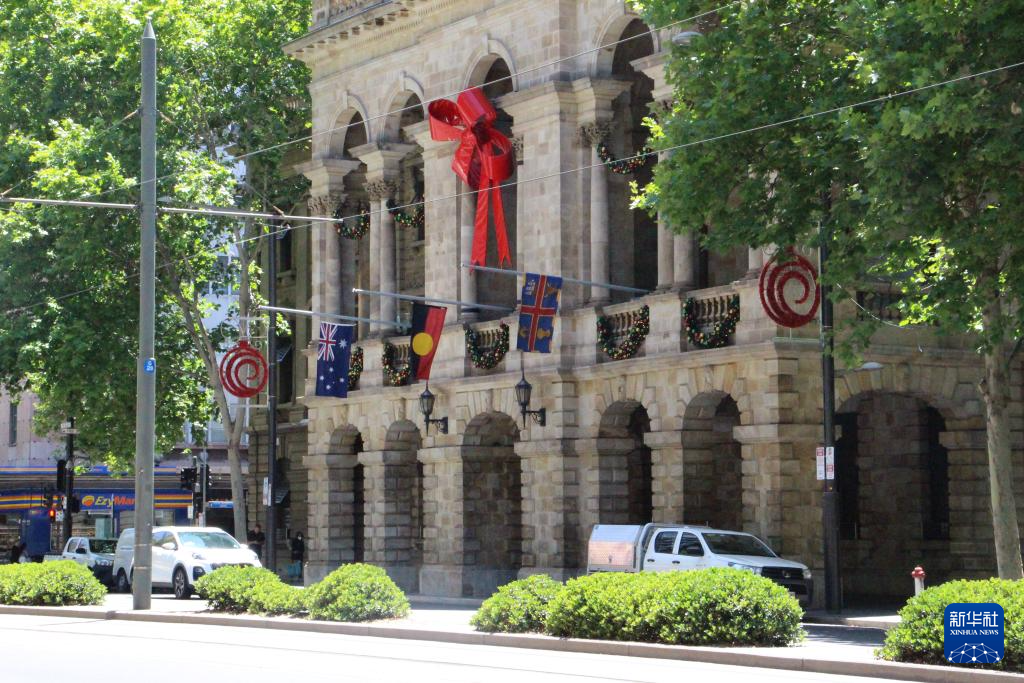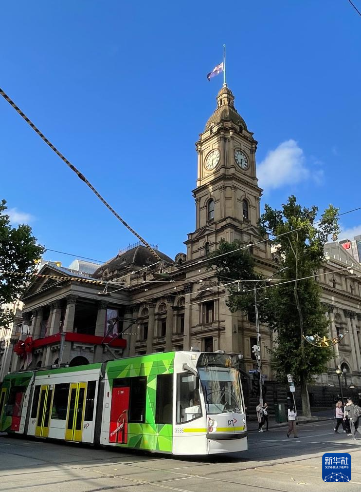 12月15日,在澳大利亚墨尔本,位于市中心的墨尔本市政厅降半旗,悼念悉尼邦迪滩枪击事件遇难者(手机照片)。