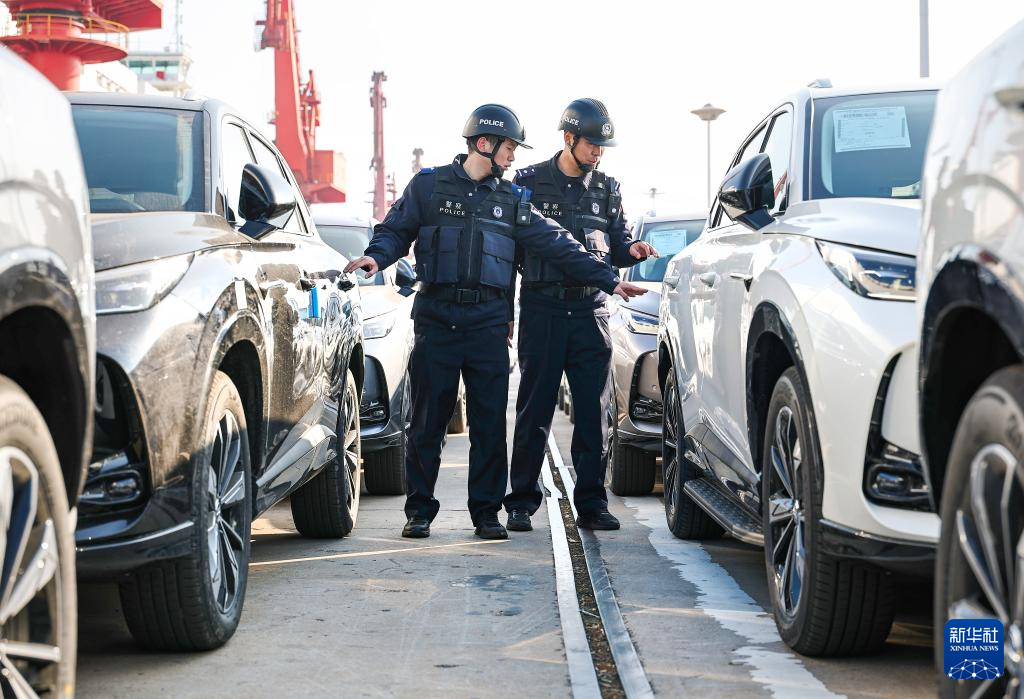 12月17日,在江苏连云港港,连云港边检站民警对即将出口的汽车进行检查。