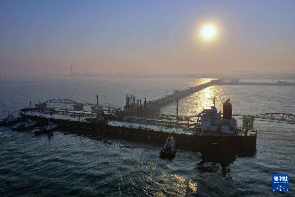 12月18日,一艘装载着17.9万吨石化原辅料的船舶泊入国投洋浦油储码头30万吨级原油泊位(无人机照片)。